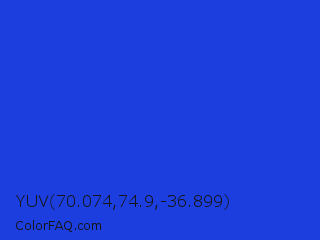 YUV 70.074,74.9,-36.899 Color is a normal blue color and the nearest color is Palatinate Blue #273be2. Hex code #1c3ede and RGB value is rgb(28,62,222). In RGB color space, this color is composed of 11% red, 24% green, 87% blue, In CMYK color space, this color is composed of 87% cyan, 72% magenta, 0% yellow , 13% black , In HSL color space, this color has a hue angle of 229° , 78% saturation and 49% lightness.