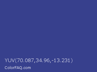 YUV 70.087,34.96,-13.231 Color is a normal blue color and the nearest color is Chambray #354e8c. Hex code #37408d and RGB value is rgb(55,64,141). In RGB color space, this color is composed of 22% red, 25% green, 55% blue, In CMYK color space, this color is composed of 61% cyan, 55% magenta, 0% yellow , 45% black , In HSL color space, this color has a hue angle of 234° , 44% saturation and 38% lightness.