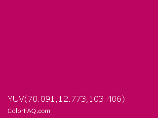 YUV 70.091,12.773,103.406 Color is a normal rose color and the nearest color is Lipstick #ab0563. Hex code #bc0560 and RGB value is rgb(188,5,96). In RGB color space, this color is composed of 74% red, 2% green, 38% blue, In CMYK color space, this color is composed of 0% cyan, 97% magenta, 49% yellow , 26% black , In HSL color space, this color has a hue angle of 330° , 95% saturation and 38% lightness.