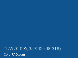 YUV 70.095,35.942,-48.318 Color is a normal blue color and the nearest color is Yale Blue #0f4d92. Hex code #0f548f and RGB value is rgb(15,84,143). In RGB color space, this color is composed of 6% red, 33% green, 56% blue, In CMYK color space, this color is composed of 90% cyan, 41% magenta, 0% yellow , 44% black , In HSL color space, this color has a hue angle of 208° , 81% saturation and 31% lightness.
