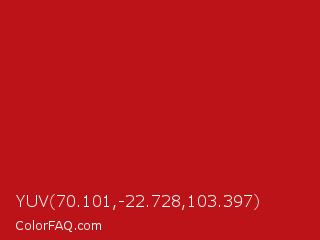 YUV 70.101,-22.728,103.397 Color is a normal red color and the nearest color is Carnelian #b31b1b. Hex code #bc1318 and RGB value is rgb(188,19,24). In RGB color space, this color is composed of 74% red, 7% green, 9% blue, In CMYK color space, this color is composed of 0% cyan, 90% magenta, 87% yellow , 26% black , In HSL color space, this color has a hue angle of 358° , 82% saturation and 41% lightness.