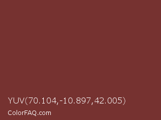 YUV 70.104,-10.897,42.005 Color is a normal red color and the nearest color is Wine #722f37. Hex code #763230 and RGB value is rgb(118,50,48). In RGB color space, this color is composed of 46% red, 20% green, 19% blue, In CMYK color space, this color is composed of 0% cyan, 58% magenta, 59% yellow , 54% black , In HSL color space, this color has a hue angle of 2° , 42% saturation and 33% lightness.
