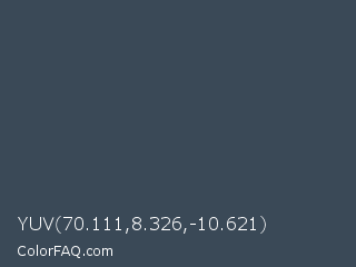 YUV 70.111,8.326,-10.621 Color is a dark blue color and the nearest color is Oxford Blue #384555. Hex code #3a4957 and RGB value is rgb(58,73,87). In RGB color space, this color is composed of 23% red, 29% green, 34% blue, In CMYK color space, this color is composed of 33% cyan, 16% magenta, 0% yellow , 66% black , In HSL color space, this color has a hue angle of 209° , 20% saturation and 28% lightness.