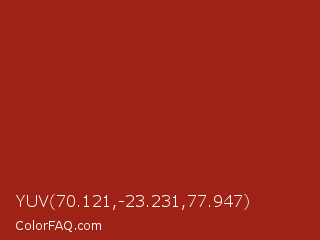 YUV 70.121,-23.231,77.947 Color is a normal red color and the nearest color is Tabasco #a02712. Hex code #9f2217 and RGB value is rgb(159,34,23). In RGB color space, this color is composed of 62% red, 13% green, 9% blue, In CMYK color space, this color is composed of 0% cyan, 79% magenta, 86% yellow , 38% black , In HSL color space, this color has a hue angle of 5° , 75% saturation and 36% lightness.