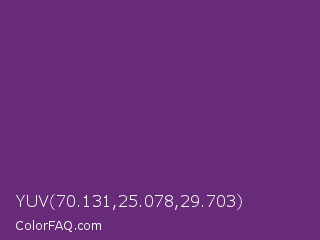 YUV 70.131,25.078,29.703 Color is a normal purple color and the nearest color is Eminence #6c3082. Hex code #682b79 and RGB value is rgb(104,43,121). In RGB color space, this color is composed of 41% red, 17% green, 47% blue, In CMYK color space, this color is composed of 14% cyan, 64% magenta, 0% yellow , 53% black , In HSL color space, this color has a hue angle of 287° , 48% saturation and 32% lightness.