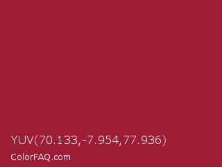 YUV 70.133,-7.954,77.936 Color is a normal red color and the nearest color is Vivid Burgundy #9f1d35. Hex code #9f1c36 and RGB value is rgb(159,28,54). In RGB color space, this color is composed of 62% red, 11% green, 21% blue, In CMYK color space, this color is composed of 0% cyan, 82% magenta, 66% yellow , 38% black , In HSL color space, this color has a hue angle of 348° , 70% saturation and 37% lightness.