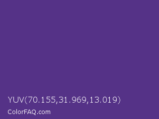 YUV 70.155,31.969,13.019 Color is a normal violet color and the nearest color is Regalia #522d80. Hex code #553287 and RGB value is rgb(85,50,135). In RGB color space, this color is composed of 33% red, 20% green, 53% blue, In CMYK color space, this color is composed of 37% cyan, 63% magenta, 0% yellow , 47% black , In HSL color space, this color has a hue angle of 265° , 46% saturation and 36% lightness.