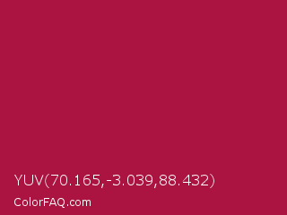 YUV 70.165,-3.039,88.432 Color is a normal rose color and the nearest color is French Wine #ac1e44. Hex code #ab1440 and RGB value is rgb(171,20,64). In RGB color space, this color is composed of 67% red, 8% green, 25% blue, In CMYK color space, this color is composed of 0% cyan, 88% magenta, 63% yellow , 33% black , In HSL color space, this color has a hue angle of 343° , 79% saturation and 37% lightness.