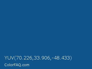 YUV 70.226,33.906,-48.433 Color is a dark blue color and the nearest color is Yale Blue #0f4d92. Hex code #0f558b and RGB value is rgb(15,85,139). In RGB color space, this color is composed of 6% red, 33% green, 55% blue, In CMYK color space, this color is composed of 89% cyan, 39% magenta, 0% yellow , 45% black , In HSL color space, this color has a hue angle of 206° , 81% saturation and 30% lightness.