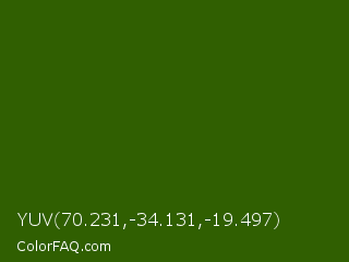 YUV 70.231,-34.131,-19.497 Color is a very dark green color and the nearest color is Dell #396413. Hex code #305f01 and RGB value is rgb(48,95,1). In RGB color space, this color is composed of 19% red, 37% green, 0% blue, In CMYK color space, this color is composed of 49% cyan, 0% magenta, 99% yellow , 63% black , In HSL color space, this color has a hue angle of 90° , 98% saturation and 19% lightness.