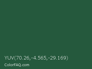 YUV 70.26,-4.565,-29.169 Color is a dark green color and the nearest color is Green Pea #1d6142. Hex code #25593d and RGB value is rgb(37,89,61). In RGB color space, this color is composed of 15% red, 35% green, 24% blue, In CMYK color space, this color is composed of 58% cyan, 0% magenta, 31% yellow , 65% black , In HSL color space, this color has a hue angle of 148° , 41% saturation and 25% lightness.