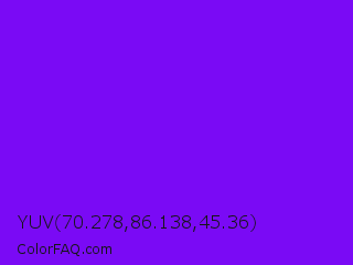 YUV 70.278,86.138,45.36 Color is a normal violet color and the nearest color is Violet Color Wheel #7f00ff. Hex code #7a0af5 and RGB value is rgb(122,10,245). In RGB color space, this color is composed of 48% red, 4% green, 96% blue, In CMYK color space, this color is composed of 50% cyan, 96% magenta, 0% yellow , 4% black , In HSL color space, this color has a hue angle of 269° , 92% saturation and 50% lightness.