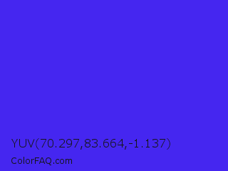 YUV 70.297,83.664,-1.137 Color is a normal indigo color and the nearest color is Han Purple #5218fa. Hex code #4526f0 and RGB value is rgb(69,38,240). In RGB color space, this color is composed of 27% red, 15% green, 94% blue, In CMYK color space, this color is composed of 71% cyan, 84% magenta, 0% yellow , 6% black , In HSL color space, this color has a hue angle of 249° , 87% saturation and 55% lightness.