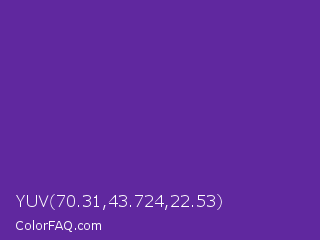 YUV 70.31,43.724,22.53 Color is a normal violet color and the nearest color is Rebecca Purple #663399. Hex code #60289f and RGB value is rgb(96,40,159). In RGB color space, this color is composed of 38% red, 16% green, 62% blue, In CMYK color space, this color is composed of 40% cyan, 75% magenta, 0% yellow , 38% black , In HSL color space, this color has a hue angle of 268° , 60% saturation and 39% lightness.