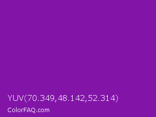 YUV 70.349,48.142,52.314 Color is a normal purple color and the nearest color is Violet RYB #8601af. Hex code #8215a8 and RGB value is rgb(130,21,168). In RGB color space, this color is composed of 51% red, 8% green, 66% blue, In CMYK color space, this color is composed of 23% cyan, 88% magenta, 0% yellow , 34% black , In HSL color space, this color has a hue angle of 284° , 78% saturation and 37% lightness.