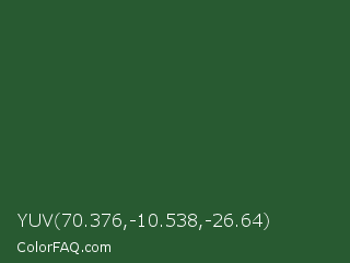 YUV 70.376,-10.538,-26.64 Color is a dark green color and the nearest color is Mughal Green #306030. Hex code #285a31 and RGB value is rgb(40,90,49). In RGB color space, this color is composed of 16% red, 35% green, 19% blue, In CMYK color space, this color is composed of 56% cyan, 0% magenta, 46% yellow , 65% black , In HSL color space, this color has a hue angle of 131° , 38% saturation and 25% lightness.
