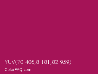 YUV 70.406,8.181,82.959 Color is a normal rose color and the nearest color is Jazzberry Jam #a50b5e. Hex code #a51357 and RGB value is rgb(165,19,87). In RGB color space, this color is composed of 65% red, 7% green, 34% blue, In CMYK color space, this color is composed of 0% cyan, 88% magenta, 47% yellow , 35% black , In HSL color space, this color has a hue angle of 332° , 79% saturation and 36% lightness.