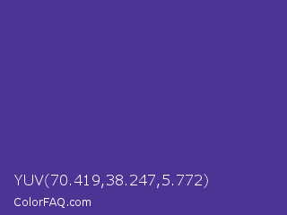 YUV 70.419,38.247,5.772 Color is a normal indigo color and the nearest color is Blue Magenta Violet #553592. Hex code #4d3494 and RGB value is rgb(77,52,148). In RGB color space, this color is composed of 30% red, 20% green, 58% blue, In CMYK color space, this color is composed of 48% cyan, 65% magenta, 0% yellow , 42% black , In HSL color space, this color has a hue angle of 256° , 48% saturation and 39% lightness.