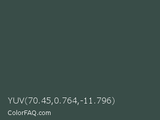 YUV 70.45,0.764,-11.796 Color is a dark cyan color and the nearest color is Outer Space #414a4c. Hex code #394d48 and RGB value is rgb(57,77,72). In RGB color space, this color is composed of 22% red, 30% green, 28% blue, In CMYK color space, this color is composed of 26% cyan, 0% magenta, 6% yellow , 70% black , In HSL color space, this color has a hue angle of 165° , 15% saturation and 26% lightness.