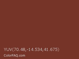YUV 70.48,-14.534,41.675 Color is a normal red color and the nearest color is Red Robin #80341f. Hex code #763429 and RGB value is rgb(118,52,41). In RGB color space, this color is composed of 46% red, 20% green, 16% blue, In CMYK color space, this color is composed of 0% cyan, 56% magenta, 65% yellow , 54% black , In HSL color space, this color has a hue angle of 9° , 48% saturation and 31% lightness.