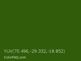 YUV 70.496,-29.332,-18.852 Color is a very dark green color and the nearest color is Dell #396413. Hex code #315d0b and RGB value is rgb(49,93,11). In RGB color space, this color is composed of 19% red, 36% green, 4% blue, In CMYK color space, this color is composed of 47% cyan, 0% magenta, 88% yellow , 64% black , In HSL color space, this color has a hue angle of 92° , 79% saturation and 20% lightness.