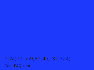 YUV 70.559,89.45,-37.324 Color is a normal blue color and the nearest color is Palatinate Blue #273be2. Hex code #1c39fc and RGB value is rgb(28,57,252). In RGB color space, this color is composed of 11% red, 22% green, 99% blue, In CMYK color space, this color is composed of 89% cyan, 77% magenta, 0% yellow , 1% black , In HSL color space, this color has a hue angle of 232° , 97% saturation and 55% lightness.
