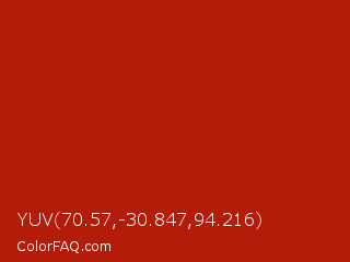 YUV 70.57,-30.847,94.216 Color is a normal red color and the nearest color is Rufous #a81c07. Hex code #b21c08 and RGB value is rgb(178,28,8). In RGB color space, this color is composed of 70% red, 11% green, 3% blue, In CMYK color space, this color is composed of 0% cyan, 84% magenta, 96% yellow , 30% black , In HSL color space, this color has a hue angle of 7° , 91% saturation and 36% lightness.