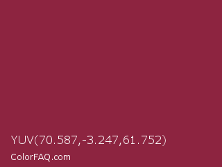YUV 70.587,-3.247,61.752 Color is a normal rose color and the nearest color is Big Dip O Ruby #9c2542. Hex code #8d2440 and RGB value is rgb(141,36,64). In RGB color space, this color is composed of 55% red, 14% green, 25% blue, In CMYK color space, this color is composed of 0% cyan, 74% magenta, 55% yellow , 45% black , In HSL color space, this color has a hue angle of 344° , 59% saturation and 35% lightness.