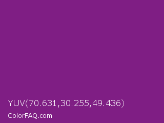 YUV 70.631,30.255,49.436 Color is a normal magenta color and the nearest color is Seance #731e8f. Hex code #7f1e84 and RGB value is rgb(127,30,132). In RGB color space, this color is composed of 50% red, 12% green, 52% blue, In CMYK color space, this color is composed of 4% cyan, 77% magenta, 0% yellow , 48% black , In HSL color space, this color has a hue angle of 297° , 63% saturation and 32% lightness.