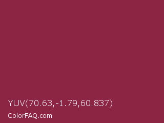YUV 70.63,-1.79,60.837 Color is a normal rose color and the nearest color is Big Dip O Ruby #9c2542. Hex code #8c2443 and RGB value is rgb(140,36,67). In RGB color space, this color is composed of 55% red, 14% green, 26% blue, In CMYK color space, this color is composed of 0% cyan, 74% magenta, 52% yellow , 45% black , In HSL color space, this color has a hue angle of 342° , 59% saturation and 35% lightness.