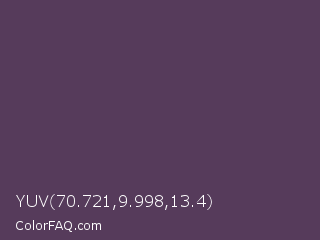 YUV 70.721,9.998,13.4 Color is a dark purple color and the nearest color is English Violet #563c5c. Hex code #563b5b and RGB value is rgb(86,59,91). In RGB color space, this color is composed of 34% red, 23% green, 36% blue, In CMYK color space, this color is composed of 5% cyan, 35% magenta, 0% yellow , 64% black , In HSL color space, this color has a hue angle of 291° , 21% saturation and 29% lightness.