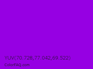 YUV 70.728,77.042,69.522 Color is a normal purple color and the nearest color is Dark Violet #9400d3. Hex code #9600e3 and RGB value is rgb(150,-0,227). In RGB color space, this color is composed of 59% red, 0% green, 89% blue, In CMYK color space, this color is composed of 34% cyan, 100% magenta, 0% yellow , 11% black , In HSL color space, this color has a hue angle of 280° , 100% saturation and 45% lightness.
