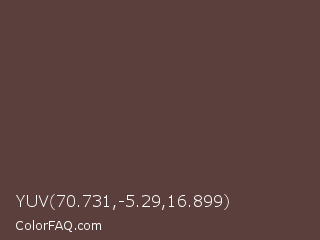 YUV 70.731,-5.29,16.899 Color is a dark red color and the nearest color is Dark Liver Horses #543d37. Hex code #5a3f3c and RGB value is rgb(90,63,60). In RGB color space, this color is composed of 35% red, 25% green, 24% blue, In CMYK color space, this color is composed of 0% cyan, 30% magenta, 33% yellow , 65% black , In HSL color space, this color has a hue angle of 6° , 20% saturation and 29% lightness.