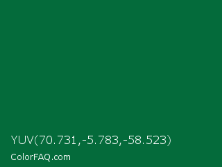 YUV 70.731,-5.783,-58.523 Color is a very dark green color and the nearest color is Fun Green #016d39. Hex code #046b3b and RGB value is rgb(4,107,59). In RGB color space, this color is composed of 2% red, 42% green, 23% blue, In CMYK color space, this color is composed of 96% cyan, 0% magenta, 45% yellow , 58% black , In HSL color space, this color has a hue angle of 152° , 93% saturation and 22% lightness.