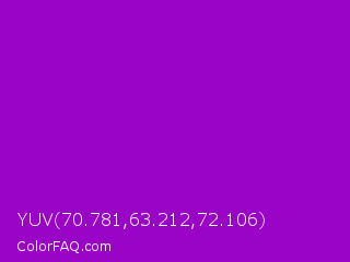 YUV 70.781,63.212,72.106 Color is a normal purple color and the nearest color is Purple Munsell #9f00c5. Hex code #9904c7 and RGB value is rgb(153,4,199). In RGB color space, this color is composed of 60% red, 2% green, 78% blue, In CMYK color space, this color is composed of 23% cyan, 98% magenta, 0% yellow , 22% black , In HSL color space, this color has a hue angle of 286° , 96% saturation and 40% lightness.