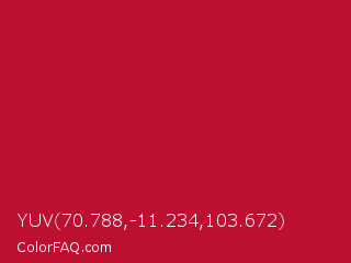 YUV 70.788,-11.234,103.672 Color is a normal red color and the nearest color is Shiraz #b20931. Hex code #bd0f30 and RGB value is rgb(189,15,48). In RGB color space, this color is composed of 74% red, 6% green, 19% blue, In CMYK color space, this color is composed of 0% cyan, 92% magenta, 75% yellow , 26% black , In HSL color space, this color has a hue angle of 349° , 85% saturation and 40% lightness.