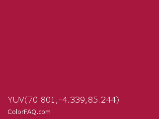 YUV 70.801,-4.339,85.244 Color is a normal rose color and the nearest color is Deep Carmine #a9203e. Hex code #a8173e and RGB value is rgb(168,23,62). In RGB color space, this color is composed of 66% red, 9% green, 24% blue, In CMYK color space, this color is composed of 0% cyan, 86% magenta, 63% yellow , 34% black , In HSL color space, this color has a hue angle of 344° , 76% saturation and 37% lightness.