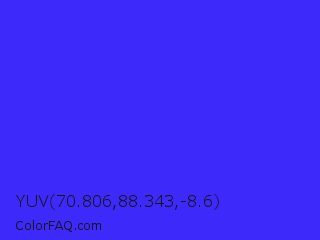 YUV 70.806,88.343,-8.6 Color is a normal indigo color and the nearest color is Han Purple #5218fa. Hex code #3d29fa and RGB value is rgb(61,41,250). In RGB color space, this color is composed of 24% red, 16% green, 98% blue, In CMYK color space, this color is composed of 76% cyan, 84% magenta, 0% yellow , 2% black , In HSL color space, this color has a hue angle of 246° , 95% saturation and 57% lightness.