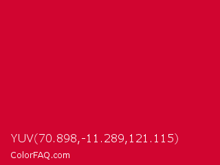 YUV 70.898,-11.289,121.115 Color is a normal red color and the nearest color is Vivid Crimson #cc0033. Hex code #d10530 and RGB value is rgb(209,5,48). In RGB color space, this color is composed of 82% red, 2% green, 19% blue, In CMYK color space, this color is composed of 0% cyan, 98% magenta, 77% yellow , 18% black , In HSL color space, this color has a hue angle of 347° , 95% saturation and 42% lightness.