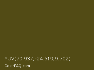 YUV 70.937,-24.619,9.702 Color is a very dark yellow color and the nearest color is Bronze Olive #4e420c. Hex code #524b15 and RGB value is rgb(82,75,21). In RGB color space, this color is composed of 32% red, 29% green, 8% blue, In CMYK color space, this color is composed of 0% cyan, 9% magenta, 74% yellow , 68% black , In HSL color space, this color has a hue angle of 53° , 59% saturation and 20% lightness.