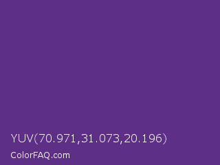 YUV 70.971,31.073,20.196 Color is a normal purple color and the nearest color is Regalia #522d80. Hex code #5e2f86 and RGB value is rgb(94,47,134). In RGB color space, this color is composed of 37% red, 18% green, 53% blue, In CMYK color space, this color is composed of 30% cyan, 65% magenta, 0% yellow , 47% black , In HSL color space, this color has a hue angle of 272° , 48% saturation and 35% lightness.