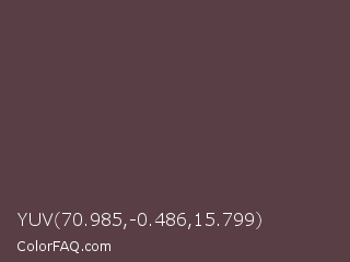 YUV 70.985,-0.486,15.799 Color is a dark rose color and the nearest color is Purple Taupe #50404d. Hex code #593e46 and RGB value is rgb(89,62,70). In RGB color space, this color is composed of 35% red, 24% green, 27% blue, In CMYK color space, this color is composed of 0% cyan, 30% magenta, 21% yellow , 65% black , In HSL color space, this color has a hue angle of 342° , 18% saturation and 30% lightness.