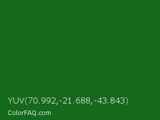 YUV 70.992,-21.688,-43.843 Color is a dark green color and the nearest color is San Felix #0b6207. Hex code #15691b and RGB value is rgb(21,105,27). In RGB color space, this color is composed of 8% red, 41% green, 11% blue, In CMYK color space, this color is composed of 80% cyan, 0% magenta, 74% yellow , 59% black , In HSL color space, this color has a hue angle of 124° , 67% saturation and 25% lightness.