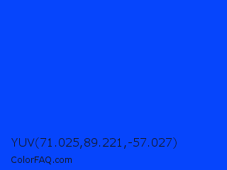 YUV 71.025,89.221,-57.027 Color is a normal blue color and the nearest color is Blue RYB #0247fe. Hex code #0645fc and RGB value is rgb(6,69,252). In RGB color space, this color is composed of 2% red, 27% green, 99% blue, In CMYK color space, this color is composed of 98% cyan, 73% magenta, 0% yellow , 1% black , In HSL color space, this color has a hue angle of 225° , 98% saturation and 51% lightness.