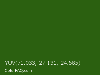 YUV 71.033,-27.131,-24.585 Color is a very dark green color and the nearest color is Dell #396413. Hex code #2b6010 and RGB value is rgb(43,96,16). In RGB color space, this color is composed of 17% red, 38% green, 6% blue, In CMYK color space, this color is composed of 55% cyan, 0% magenta, 83% yellow , 62% black , In HSL color space, this color has a hue angle of 100° , 71% saturation and 22% lightness.
