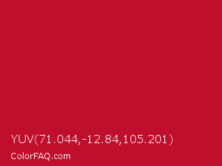 YUV 71.044,-12.84,105.201 Color is a normal red color and the nearest color is Shiraz #b20931. Hex code #bf0f2d and RGB value is rgb(191,15,45). In RGB color space, this color is composed of 75% red, 6% green, 18% blue, In CMYK color space, this color is composed of 0% cyan, 92% magenta, 76% yellow , 25% black , In HSL color space, this color has a hue angle of 350° , 85% saturation and 40% lightness.