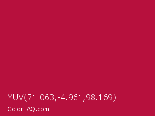 YUV 71.063,-4.961,98.169 Color is a normal rose color and the nearest color is Shiraz #b20931. Hex code #b7103d and RGB value is rgb(183,16,61). In RGB color space, this color is composed of 72% red, 6% green, 24% blue, In CMYK color space, this color is composed of 0% cyan, 91% magenta, 67% yellow , 28% black , In HSL color space, this color has a hue angle of 344° , 84% saturation and 39% lightness.