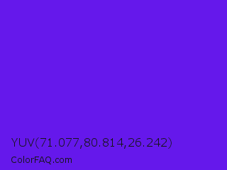 YUV 71.077,80.814,26.242 Color is a normal violet color and the nearest color is Han Purple #5218fa. Hex code #6518eb and RGB value is rgb(101,24,235). In RGB color space, this color is composed of 40% red, 9% green, 92% blue, In CMYK color space, this color is composed of 57% cyan, 90% magenta, 0% yellow , 8% black , In HSL color space, this color has a hue angle of 262° , 84% saturation and 51% lightness.