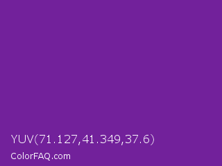 YUV 71.127,41.349,37.6 Color is a normal purple color and the nearest color is Seance #731e8f. Hex code #72219b and RGB value is rgb(114,33,155). In RGB color space, this color is composed of 45% red, 13% green, 61% blue, In CMYK color space, this color is composed of 26% cyan, 79% magenta, 0% yellow , 39% black , In HSL color space, this color has a hue angle of 280° , 65% saturation and 37% lightness.