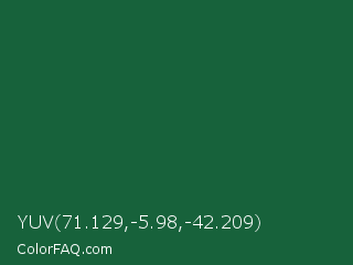 YUV 71.129,-5.98,-42.209 Color is a dark green color and the nearest color is Green Pea #1d6142. Hex code #17623b and RGB value is rgb(23,98,59). In RGB color space, this color is composed of 9% red, 38% green, 23% blue, In CMYK color space, this color is composed of 77% cyan, 0% magenta, 40% yellow , 62% black , In HSL color space, this color has a hue angle of 149° , 62% saturation and 24% lightness.
